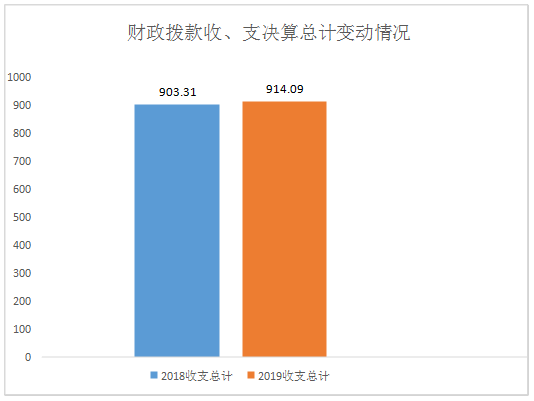 四、财政拨款收入支出决算总体情况说明 2019年财政拨款收、支总计914.09万元。与2018年相比,财政拨款收、支总计各增加10.78万元,增长1.19%。主要变动原因是义教均衡迎国检,政府加大对教育的投入,进行了校园文化建设,另外也增加了一个教学班。