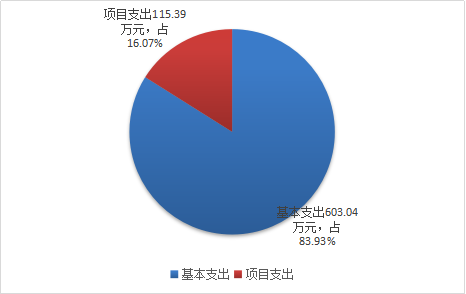 三、支出决算情况说明 2019年本年支出合计718.43万元,其中:基本支出603.04万元,占83.93%;项目支出115.39万元,占16.07%;上缴上级支出0万元,占0%;经营支出0万元,占0%;对附属单位补助支出0万元,占0%。