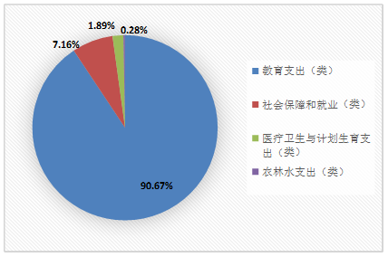 (二)一般公共预算财政拨款支出决算结构情况 2019年一般公共预算财政拨款支出533.43万元,主要用于以下方面:教育支出(类)483.66万元,占90.67%;社会保障和就业(类)支出38.2万元,占7.16%;卫生健康支出(类)10.07万元,占1.89%;农林水支出(类)1.49万元,占0.28%。