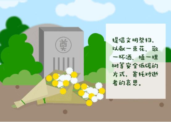 自觉摒弃焚烧纸钱、燃放鞭炮等传统祭扫方式,不购买、不使用塑料、锡箔等不可降解祭祀用品,倡导以敬献鲜花、植树绿化、家庭追思等文明低碳方式缅怀故人,将祭拜逝者的传统习俗以更加环保、健康、安全的方式表达,树立文明祭扫新风尚。