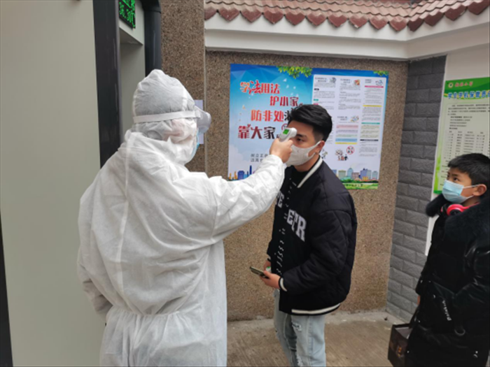其次是演练活动,主要分为学生入校体温监测演练和学生在教室时突发情况处置演练。首先,学校门口设置了两个进校闸口,学生排好队依次进入校园。演练中,学生保持前后一米的距离有序等待,门卫值班人员和值班教师使用先进的红外线体温检测仪对进入校园的学生进行测温,当发现异常体温情况并再次测量后,第一时间报告值班领导,由值班领导将该教职工护送至临时观察室进行隔离,并通知家长及就近医院急诊部门。演练过程中学生”能井然有序的进入校园。在其后的教室突发情况处置演练中,对于体温异常的学生,教师能迅速地将其带出教室,并报告学校领导,做到快速、准确地处理。