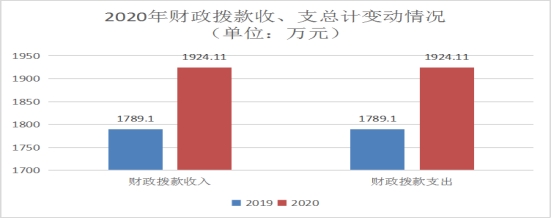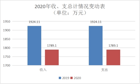 2020年度收、支总计1924.11万元。与2019年相比,收、支总计各增加135.01万元,增长7.55%。主要变动原因是上年结转结余以及脱贫攻坚工作经费、人员经费增加。