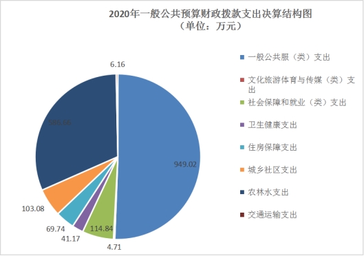 2020年一般公共预算财政拨款支出1875.38万元,主要用于以下方面:一般公共服务(类)支出949.02万元,占50.6%;文化旅游体育与传媒(类)支出4.71万元,占0.25%;社会保障和就业(类)支出114.84万元,占6.12%;卫生健康支出41.17万元,占2.2%;住房保障支出69.74万元,占3.72%;城乡社区(类)支出103.08万元,占5.5%;农林水(类)支出586.66万元,占31.28%;交通运输支出(类)支出6.16,占0.33%。
