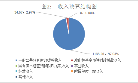 2019年本年收入合计1167.93万元,其中:一般公共预算财政拨款收入1133.26万元,占97.03%;政府性基金预算财政拨款收入34.67万元,占2.97%;上级补助收入0万元,占0%;事业收入0万元,占0%;经营收入0万元,占0%;附属单位上缴收入0万元,占0%;其他收入0万元,占0%。
