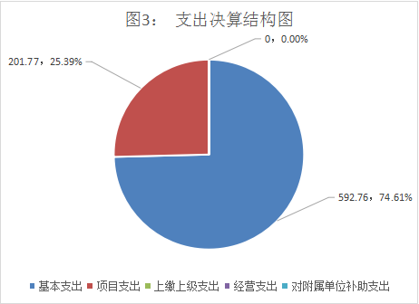2019年本年支出合计794.53万元,其中:基本支出592.76万元,占74.61%;项目支出201.77万元,占25.39%;上缴上级支出0万元,占0%;经营支出0万元,占0%;对附属单位补助支出0万元,占0%。