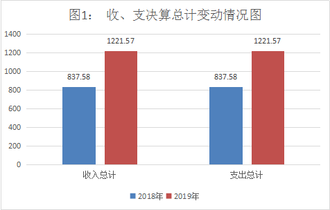 2019年度收、支总计1221.57万元。与2018年相比,收、支总计各增加384万元,增长45.85%。主要变动原因是加强了基础设施建设和项目增多。