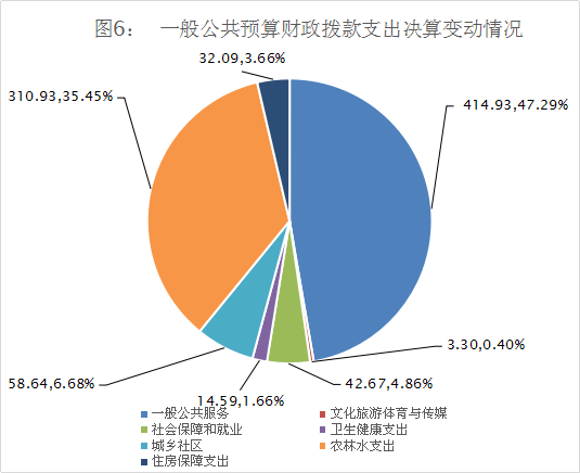 2020年一般公共预算财政拨款支出877.16万元,主要用于以下方面:一般公共服务(类)支出414.93万元,占47.29%;文化旅游体育与传媒(类)支出3.30万元,占0.4%;社会保障和就业(类)支出42.67万元,占4.86%;卫生健康支出14.59万元,占1.66%;城乡社区(类)支出58.64万元,占6.68%;农林水(类)支出310.93万元 ,占35.45%;住房保障支出32.09万元,占3.66%。