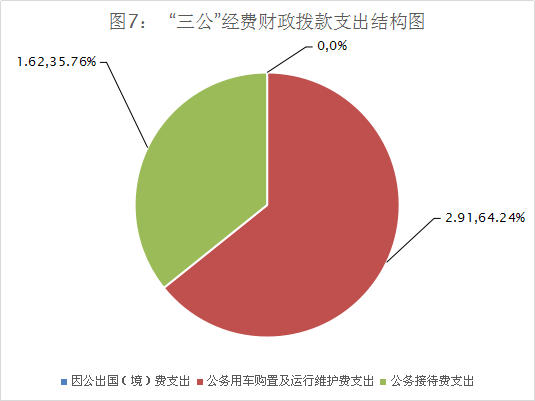 2020年“三公”经费财政拨款支出决算中,因公出国(境)费支出决算0万元,占0%;公务用车购置及运行维护费支出决算2.91万元,占64.24%;公务接待费支出决算1.62万元,占35.76%。具体情况如下: