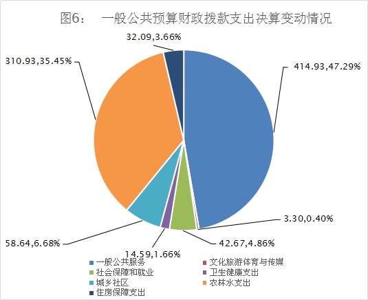 2020年一般公共预算财政拨款支出877.16万元,主要用于以下方面:一般公共服务(类)支出414.93万元,占47.29%;文化旅游体育与传媒(类)支出3.30万元,占0.4%;社会保障和就业(类)支出42.67万元,占4.86%;卫生健康支出14.59万元,占1.66%;城乡社区(类)支出58.64万元,占6.68%;农林水(类)支出310.93万元 ,占35.45%;住房保障支出32.09万元,占3.66%。