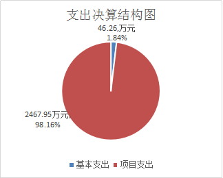 2019年本年支出合计2514.21万元,其中:基本支出46.26万元,占1.84%;项目支出2467.95万元,占98.16%,上缴上级支出0万元,占0%;经营支出0万元,占0%;对附属单位补助支出0万元,占0%。