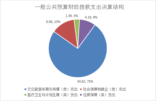 2018年一般公共预算财政拨款支出46.26万元,主要用于以下方面:文化旅游体育与传媒(类)支出34.62万元,占74.84%,社会保障和就业(类)支出6.06万元,占13.1%;医疗卫生与计划生育(类)支出1.39万元,占3%;住房保障(类)支出4.19万元,占9.06%。