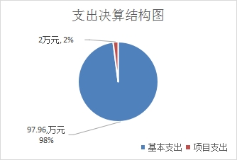 2020年本年支出合计99.96万元,其中:基本支出97.96万元,占98%;项目支出2万元,占2%;上缴上级支出0万元,占0%;经营支出0万元,占0%;对附属单位补助支出0万元,占0%。
