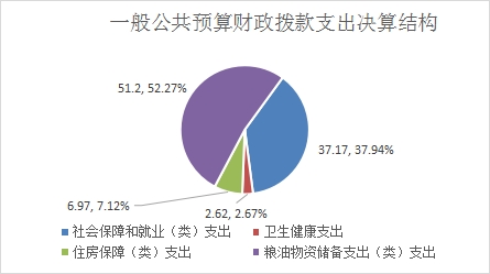 2020年一般公共预算财政拨款支出97.96万元,主要用于以下方面:社会保障和就业(类)支出37.17万元,占37.94%;卫生健康支出2.62万元,占2.67%;住房保障(类)支出6.97万元,占7.12%;粮油物资储备支出(类)支出51.20万元,占52.27%。