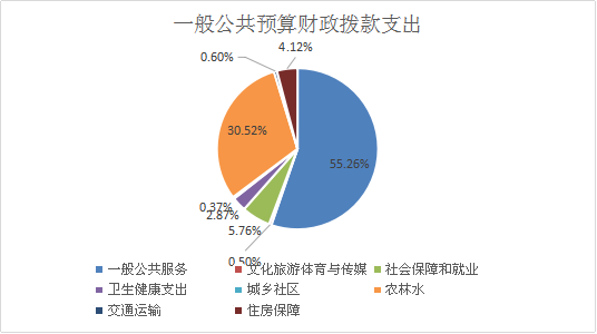 2020年一般公共预算财政拨款支出994.78万元,主要用于以下方面:一般公共服务(类)支出549.67万元,占55.26%;文化旅游体育与传媒(类)支出5万元,占0.5%;社会保障和就业(类)支出57.29万元,占5.76%;卫生健康支出(类)支出28.51万元,占2.87%;城乡社区(类)支出3.7万元,占0.37%;农林水(类)支出303.65万元,占30.52%;交通运输(类)支出5.96万元,占0.60%;住房保障(类)支出41万元,占4.12%。