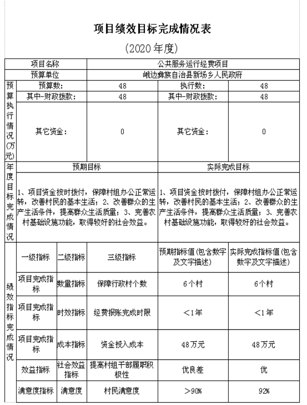 2.项目应实现的具体绩效目标,包括目标的量化、细化情况以及项目实施进度计划等。全乡6个村,每村8万元经费,其中:每村村级办公经费、公共服务运行维护经费各4万元,6个村项目都已实施完成,并完成项目经费报账。