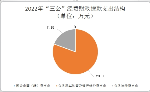 2022年“三公”经费财政拨款支出决算中,因公出国(境)费支出决算0万元,占0%;公务用车购置及运行维护费支出决算29.8万元,占80.6%;公务接待费支出决算7.18万元,占19.4%。具体情况如下: