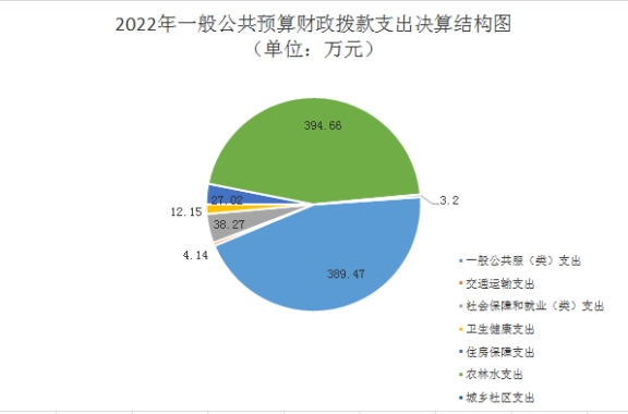 2022年一般公共预算财政拨款支出868.91万元,主要用于以下方面: 一般公共服务支出389.47万元,占44.8%;社会保障和就业支出38.27万元,占4.4%;卫生健康支出12.15万元,占1.4%;城乡社区支出3.2万元,占0.4%;农林水支出394.66万元,占45.4%;交通运输支出4.14万元,占0.5%。
