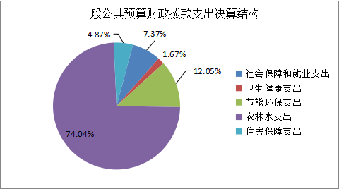 2019年一般公共预算财政拨款支出363.06万元,主要用于以下方面:社会保障和就业支出(类)支出26.74万元,占7.37%;卫生健康支出(类)6.07万元,占1.67%;节能环保支出(类)支出43.76万元,占12.05%;农林水支出(类)支出268.82万元,占74.04%;住房保障支出(类)支出17.67万元,占4.87%。