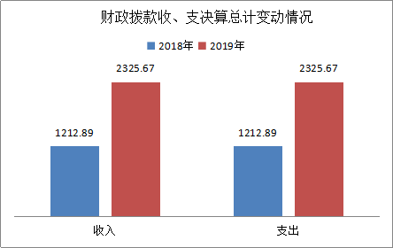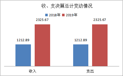 2019年度收、支总计2325.67万元。与2018年相比,收、支总计各增加1112.78万元,增长91.75%。主要变动原因是本年度新增生态保护支撑体系中央预算内投资支出(保护区基础设施建设项目)所占资金比重大。