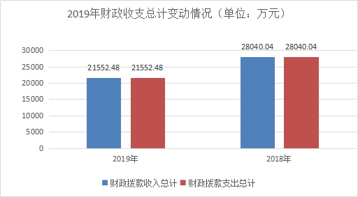 2019年财政拨款收、支总计21552.48万元。与2018年相比,财政拨款收、支总计各减少6487.56万元,下降23.14%。主要变动原因是留有去年结转结余及项目精准化。
