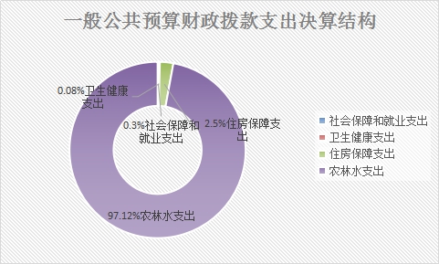 2019年一般公共预算财政拨款支出12550.24万元,主要用于以下方面:社会保障和就业支出42.69万元,占0.34%;卫生健康支出10.11万元,占0.08%;农林水支出12188.94万元,占97.12%;住房保障支出308.5万元,占2.46%。