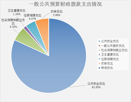 2020年一般公共预算财政拨款支出5199.31万元,主要用于以下方面:公共安全支出(类)支出4260.74万元,占81.95%;教育支出(类)0万元,占0%;科学技术(类)支出0万元,占0%;文化旅游体育与传媒(类)支出0万元,占0%;社会保障和就业(类)支出330.12万元,占6.35%;卫生健康支出69.5万元,占1.34%;住房保障支出227.39万元,占4.37%;农林水支出(类)311.56万元,占5.99%。