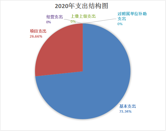 2020年本年支出合计5199.31万元,其中:基本支出3813.21万元,占73.34%;项目支出1386.1万元,占26.66%;上缴上级支出0万元,占0%;经营支出0万元,占0%;对附属单位补助支出0万元,占0%。
