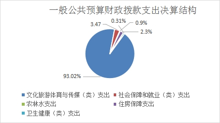 2020年一般公共预算财政拨款支出1639.95万元,主要用于以下方面:文化旅游体育与传媒(类)支出1525.44万元,占93.02%;社会保障和就业(类)支出56.89万元,占3.47%;卫生健康(类)支出14.69万元,占0.9%;农林水支出5.23万元,占0.31%;住房保障支出37.7万元,占2.3%。