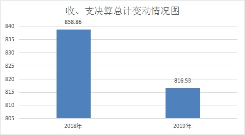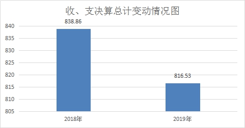 2019年度收、支总计816.53万元。与2018年相比,收、支总计各减少22.33万元,下降2.66%。主要变动原因是项目资金减少。