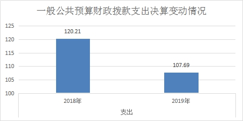 2019年一般公共预算财政拨款支出107.69万元,占本年支出合计的100%。与2018年相比,一般公共预算财政拨款增加减少12.52万元,减少10.42%。主要变动原因是人员经费减少和项目资金减少。