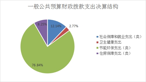 2019年一般公共预算财政拨款支出107.69万元,主要用于以下方面:社会保障和就业支出(类)支出13.07万元,占12.14%;卫生健康支出2.98万元,占2.77%;节能环保支出(类)支出82.75万元,占76.84%;住房保障支出(类)支出8.89万元,占8.25%。