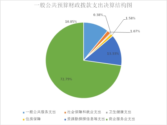 2019年一般公共预算财政拨款支出975.20万元,主要用于以下方面:一般公共服务(类)支出105.82万元,占10.85%;教育支出(类)0万元,占0%;科学技术(类)支出0万元,占0%;文化旅游体育与传媒(类)支出0万元,占0%;社会保障和就业(类)支出15.37万元,占1.58%;卫生健康支出3.70万元,占0.38%;住房保障支出10.47万元,占1.07%;资源勘探信息等支出(类)支出130万元,占13.33%;商业服务业等支出(类)支出709.84万元,占72.79%