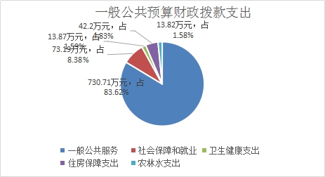 2019年一般公共预算财政拨款支出873.79万元,主要用于以下方面:一般公共服务(类)支出730.71万元,占83.62%;社会保障和就业(类)支出73.19万元,占8.38%;卫生健康支出13.87万元,占1.59%;住房保障支出42.2万元,占4.83%;农林水支出13.82万元,占1.58%。