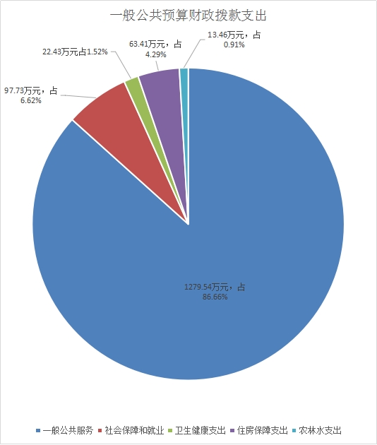 2020年一般公共预算财政拨款支出1476.57万元,主要用于以下方面:一般公共服务(类)支出1279.54万元,占86.66%;社会保障和就业(类)支出97.73万元,占6.62%;卫生健康支出22.43万元,占1.52%;住房保障支出63.41万元,占4.29%;农林水支出13.46万元,占0.91%。