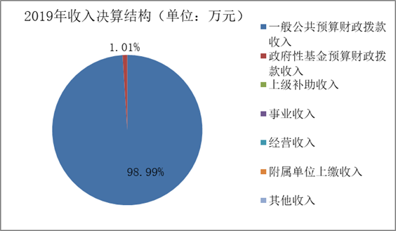 2019年本年收入合计15472.74万元,其中:一般公共预算财政拨款收入15316.43万元,占98.99%;政府性基金预算财政拨款收入156.32万元,占1.01%;上级补助收入0万元,占0%;事业收入0万元,占0%;经营收入0万元,占0%;附属单位上缴收入0万元,占0%;其他收入0万元,占0%。