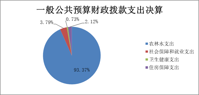 2019年一般公共预算财政拨款支出7911.44万元,主要用于以下方面:农林水支出7386.52万元,占93.37%;社会保障和就业支出299.8万元,占3.79%;卫生健康支出57.47万元,占0.72%;住房保障支出167.65万元,占2.12%。