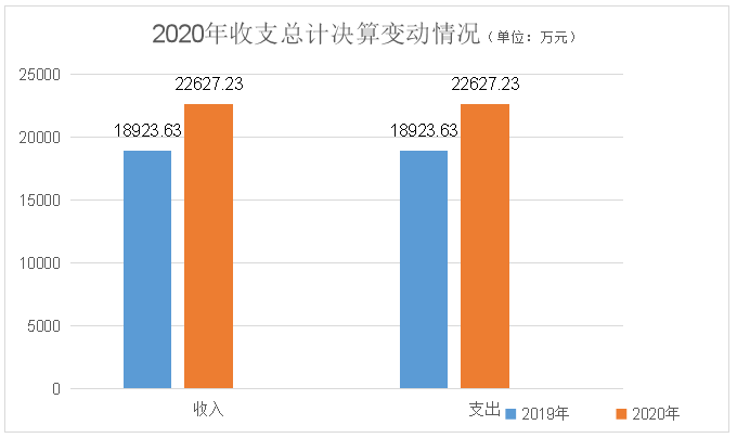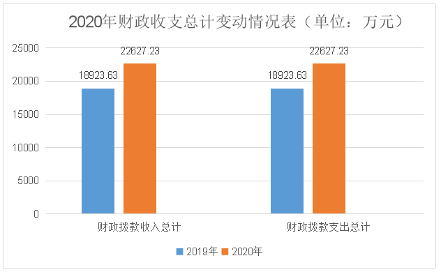 2020年度收、支总计22627.23万元。与2019年相比,收、支总计各增加3703.6万元,增长19.57%。主要变动原因是本年度脱贫攻坚产业项目增加。