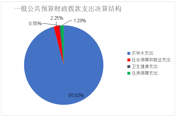 2020年一般公共预算财政拨款支出12725.27万元,主要用于以下方面:农林水支出12206.08万元,占95.92%;社会保障和就业支出285.93万元,占2.25%;卫生健康支出70.54万元,占0.55%;住房保障支出162.72万元,占1.28%。