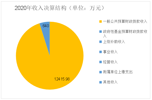2020年本年收入合计13055.98万元,其中:一般公共预算财政拨款收入12415.98万元,占95.1%;政府性基金预算财政拨款收入640万元,占4.9%;上级补助收入0万元,占0%;事业收入0万元,占0%;经营收入0万元,占0%;附属单位上缴收入0万元,占0%;其他收入0万元,占0%。
