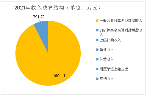 2021年本年收入合计10712.34万元,其中:一般公共预算财政拨款收入9921.11万元,占92.61%;政府性基金预算财政拨款收入791.22万元,占7.39%;国有资本经营预算财政拨款收入0万元,占0%;上级补助收入0万元,占0%;事业收入0万元,占0%;经营收入0万元,占0%;附属单位上缴收入0万元,占0%;其他收入0万元,占0%。