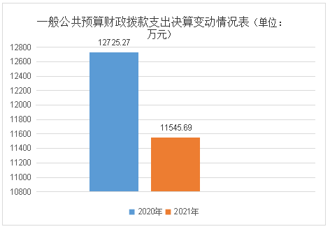 2021年一般公共预算财政拨款支出11545.69万元,占本年支出合计的93.59%。与2020年相比,一般公共预算财政拨款支出减少1179.58万元,下降9.27%。主要变动原因是本年度项目减少。