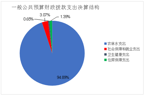 2021年一般公共预算财政拨款支出11545.69万元,主要用于以下方面:农林水支出10955.97万元,占94.89%;社会保障和就业支出354.55万元,占3.07%;卫生健康支出74.51万元,占0.65%;住房保障支出160.67万元,占1.39%。