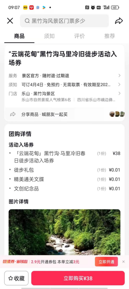 打开抖音团购搜“黑竹沟景区”