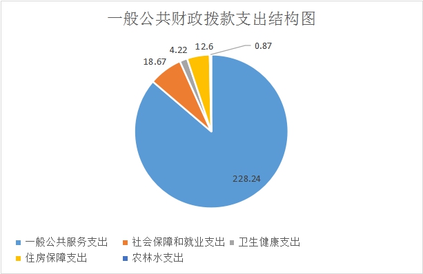 2019年一般公共预算财政拨款支出264.6万元,主要用于以下方面:一般公共服务(类)支出228.24万元,占86.26%;社会保障和就业(类)支出18.67万元,占7.06%;卫生健康支出4.22万元,占1.59%;住房保障支出12.6万元,占4.76%;农林水支出0.87万元,点0.33%。