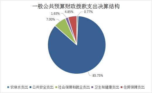 2019年一般公共预算财政拨款支出1077.45万元,主要用于以下方面:公共安全(类)支出923.87万元,占85.75%;社会保障和就业(类)支出75.42万元,占7.00%;卫生健康支出17.6万元,占1.63%;住房保障支出52.23万元,占4.85%;农林水支出(类)支出8.33万元,占0.77%。