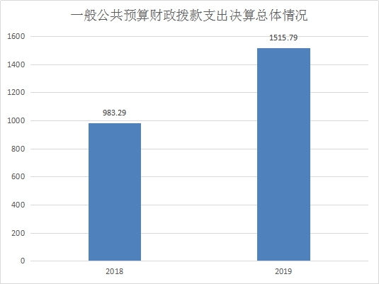 2019年一般公共预算支出决算数为1515.79万元,完成预算81.56%,决算数小于预算数的主要原因是年末有结转。其中: