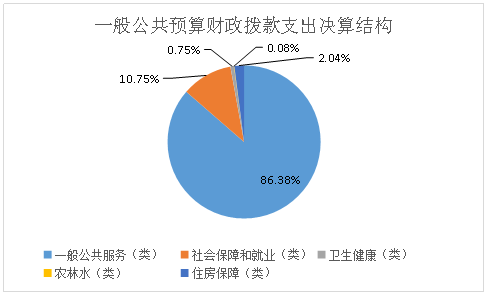 2020年一般公共预算财政拨款支出1703.06万元,主要用于以下方面:一般公共服务(类)支出1471.08万元,占86.38%;社会保障和就业(类)支出183.24万元,占10.75%;卫生健康(类)支出12.69万元,占0.75%;农林水(类)支出1.32万元,占0.08%;住房保障(类)支出34.73万元,占2.04%。