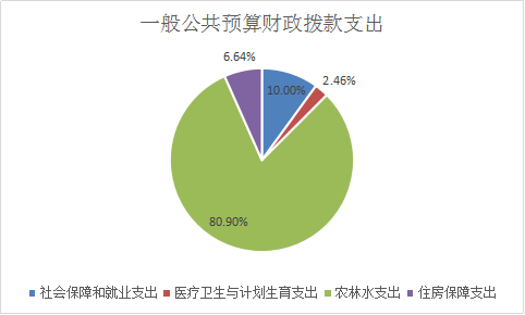 2019年一般公共预算财政拨款支出596.85万元,主要用于以下方面:社会保障和就业支出59.68万元,占10%;医疗卫生与计划生育支出14.68万元,占2.46%;农林水支出482.86万元,占80.9%;住房保障支出39.63万元,占6.64% 。
