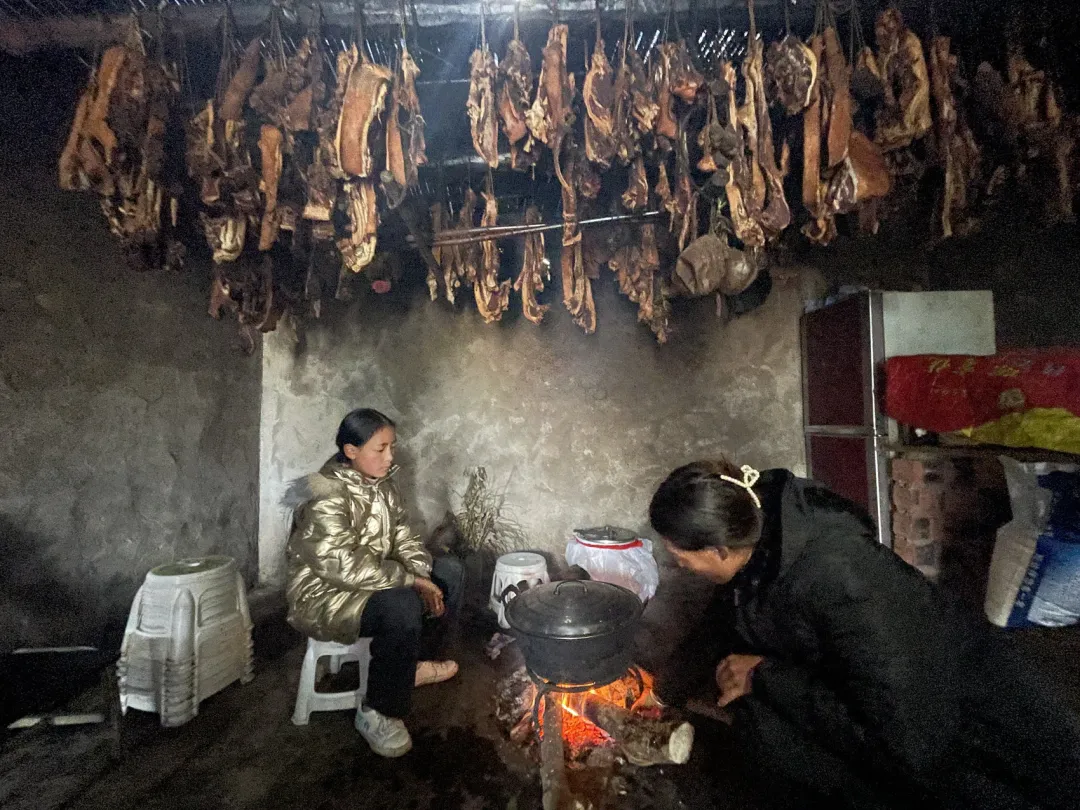 李里军体在中庭招呼客人,妻子沙玛吉古和孩子们在厨房里忙得不亦乐乎。现杀现做的坨坨鸡、塘火烤的小凉山土豆、挂满整面墙的老腊肉,这是彝族群众过春节必不可少的三样菜肴。“起码还要再杀7头猪。”看着春节火爆的生意,沙玛吉古直言今年腊肉准备少了。