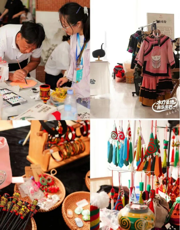 泼水之余,现场特别设置的彝族刺绣、漆扇制作、民族服饰三大非遗体验点,吸引了众多游客驻足参与,不少大人都带着小朋友感受这非遗文化的独特魅力。手工艺品摊位前,现场展示的彝族文创产品成为游客争相购买的“非遗伴手礼”。